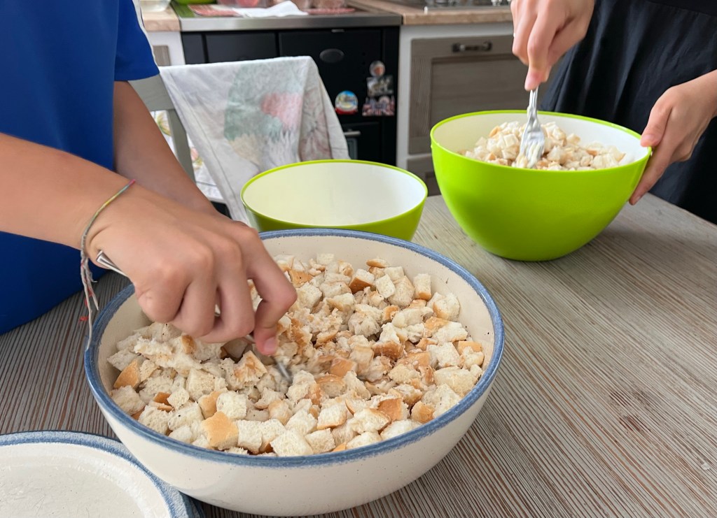 First the bread was cut into bits and left out to dry overnight. Then Maria warmed milk on the stove with black pepper, and poured the liquid over the bread. Davide helped her mash and mix the damp bread, then covered it to hold the moister and let sit.
