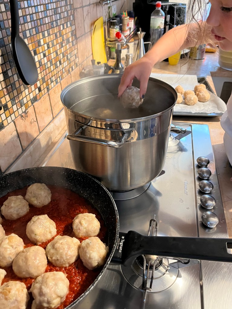 With parental guidance, Emma gingerly and excitedly placed the dumplings into a pot of boiling broth. Because the only raw ingredient is eggs, they don’t take long to cook. Once the balls floated to the surface of the broth, they were done and placed in the tomato sauce.