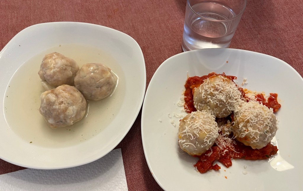 Canederli is served either with tomato sauce or broth, according to preference. Like every good dish, it is topped with grana (grated parmigiana).
