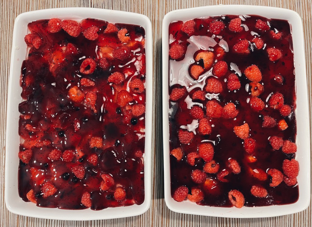 As for the pretzel jello salad, I was rather worried. You see- Italy doesnβt have jello. We looked in three different stores and found no jello. But they do have a clear sugar gelatin for fruit tarts. So we got creative and added some blueberry marmalade to the gelatin mix. The result wasnβt exactly like my momβsβ¦ but it was good! Everyone was surprised by how well the salty pretzels complimented this sweet dish. It was a hit!