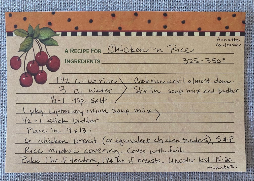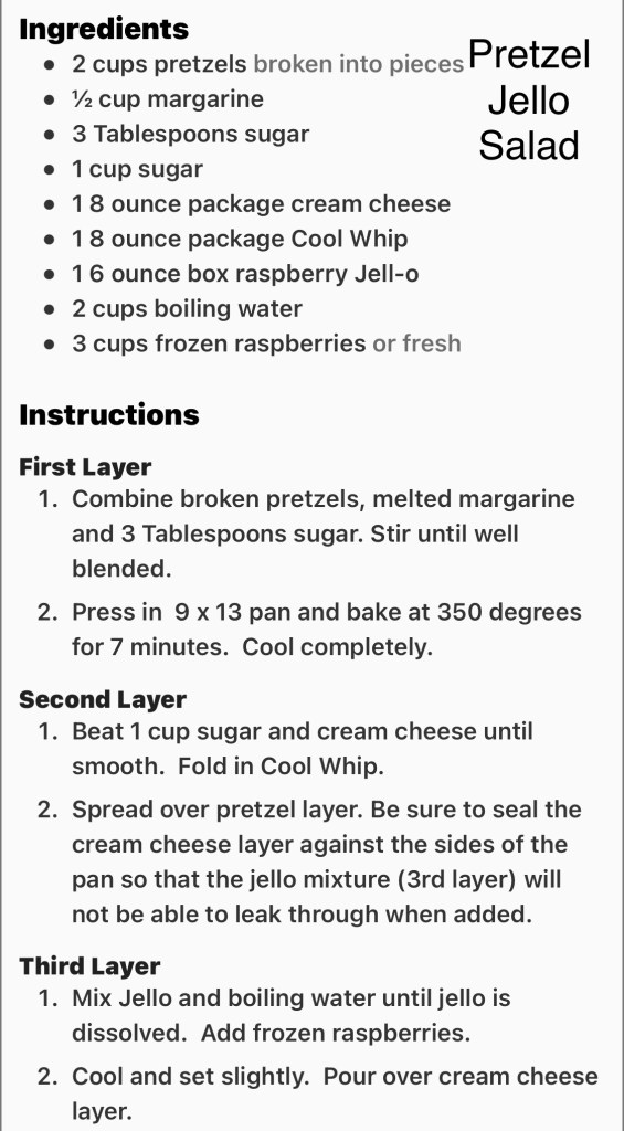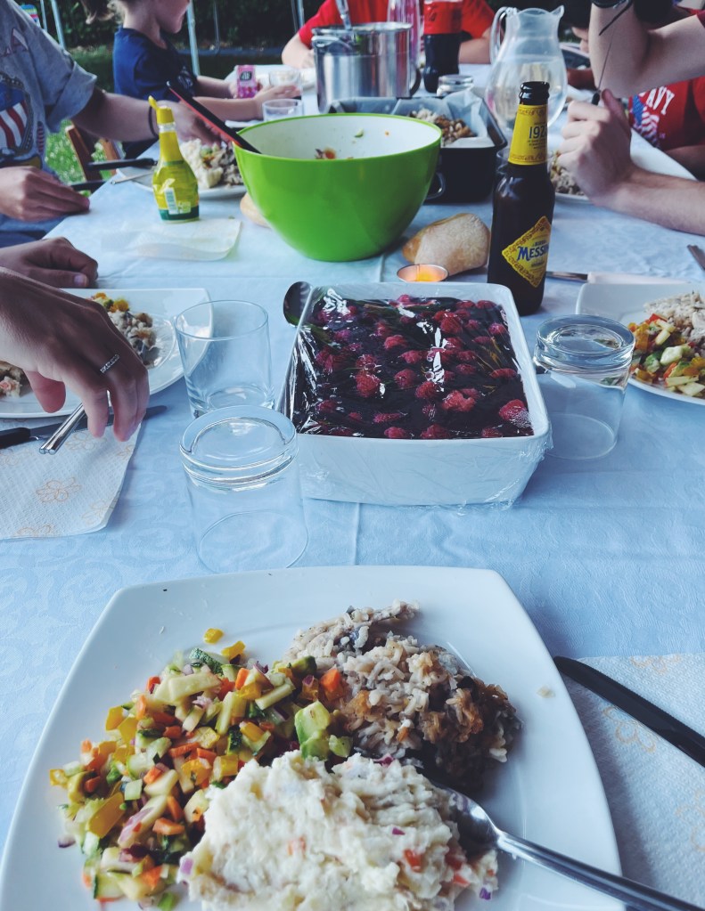 This was not only an American meal, but a Stewart meal. I used my grandmaβs recipe for chicken and rice casserole, and discovered that the original recipe was from my great-grandma! I used my momβs recipes for pretzel jello salad and rainbow chopped salad. I didnβt use a specific recipe for the potato salad- I just made it to my liking.